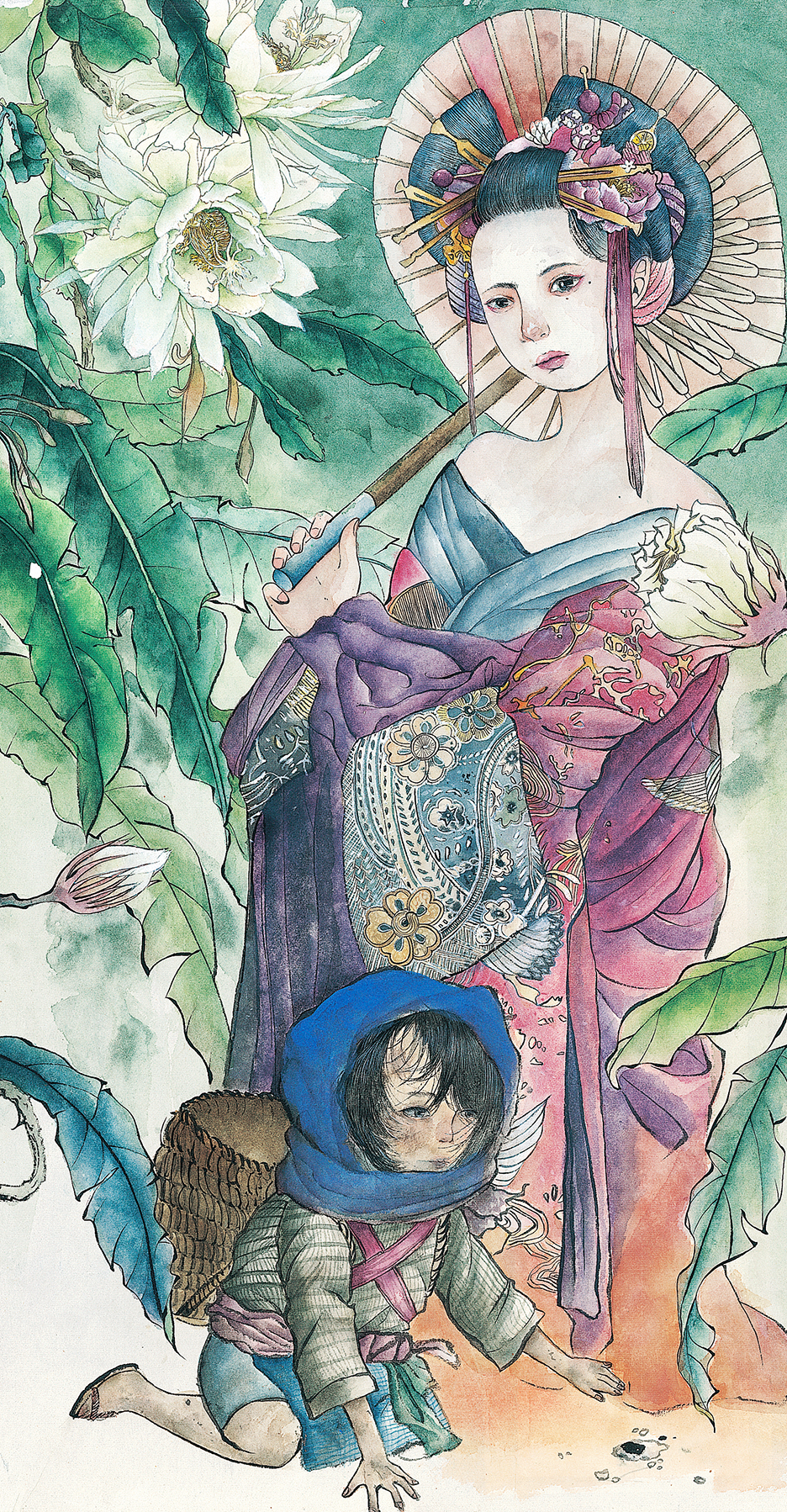 以高大富貴的花魁映襯瘦弱貧窮的小孩,畫面穿插盛開的曇花,暗喻富貴與貧窮僅一線之隔, 但卻無法輕易改變。孩童的眼神中缺乏該有的純真,只流露出一種淒苦的無奈和超乎年齡的負擔。