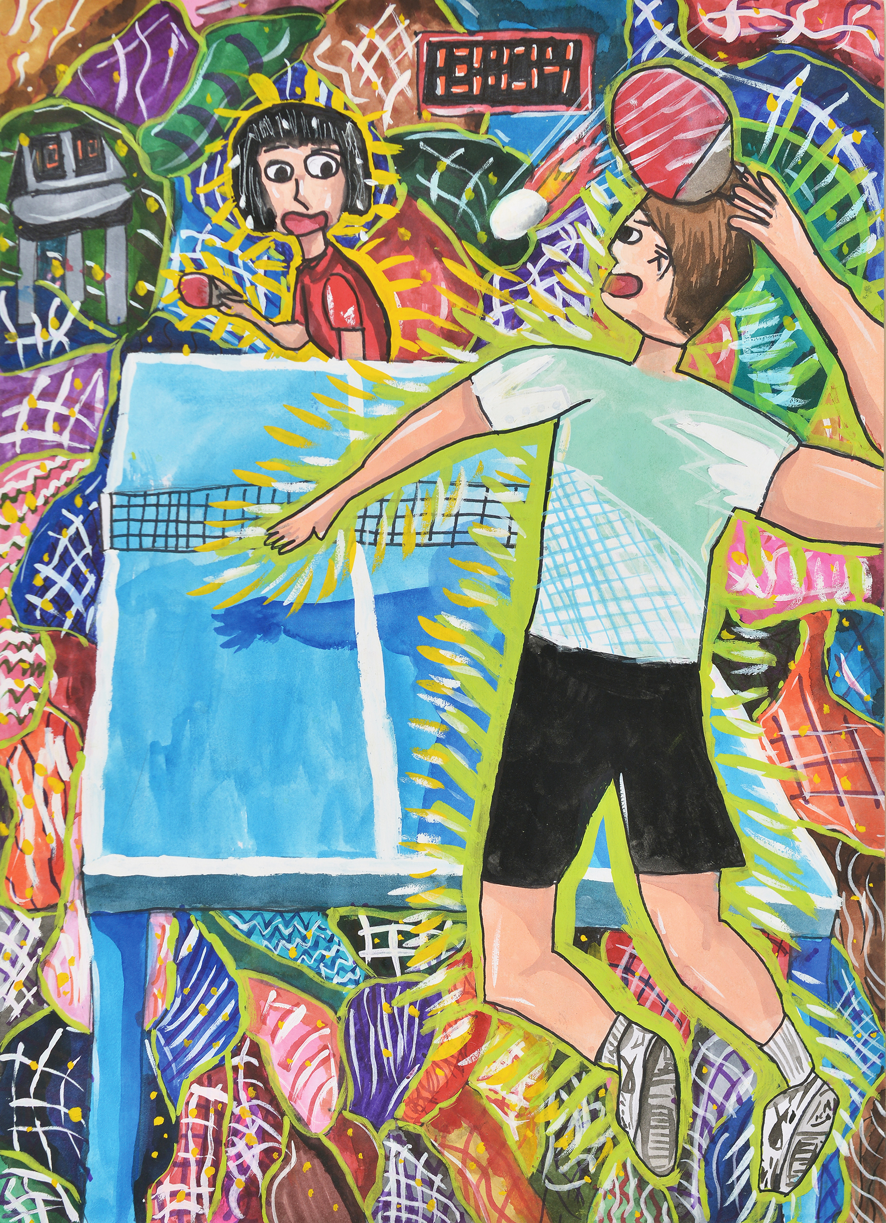 兩位桌球選手正在進行一場激烈的比賽,你來我往的,真刺激! 最後比分來到十比十關鍵球,突然咻的一聲,出現了一記殺球,對方猝不及防,以迅雷不及掩耳的速度結束了比賽。