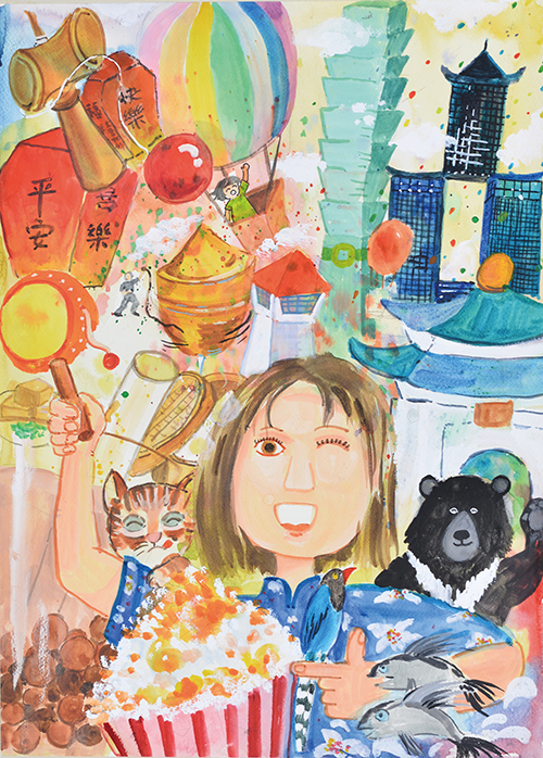 這幅畫畫了許多臺灣的特有動物和小吃,凸顯畫者對臺灣的喜愛,最後畫上一些色 彩繽紛的彩帶,營造歡樂的氣氛。