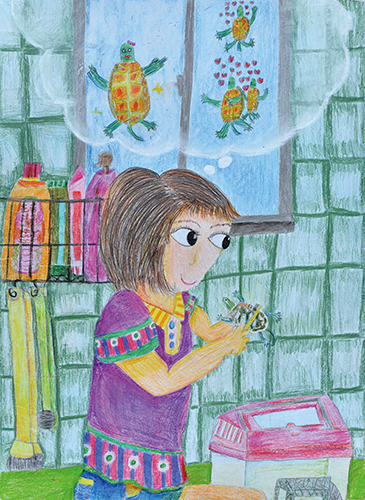 我有一隻名叫「星寶」的長尾 龜,我很喜歡牠,也會幫牠洗 澡,畫中的我想像乾淨健康的 「星寶」可以交到很多朋友。